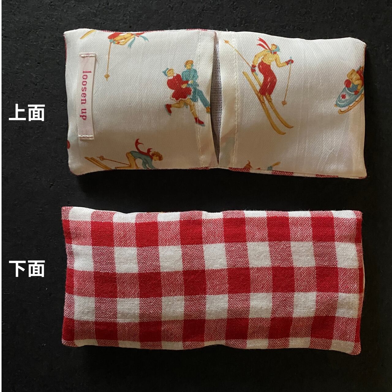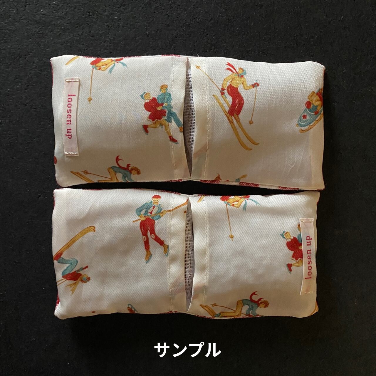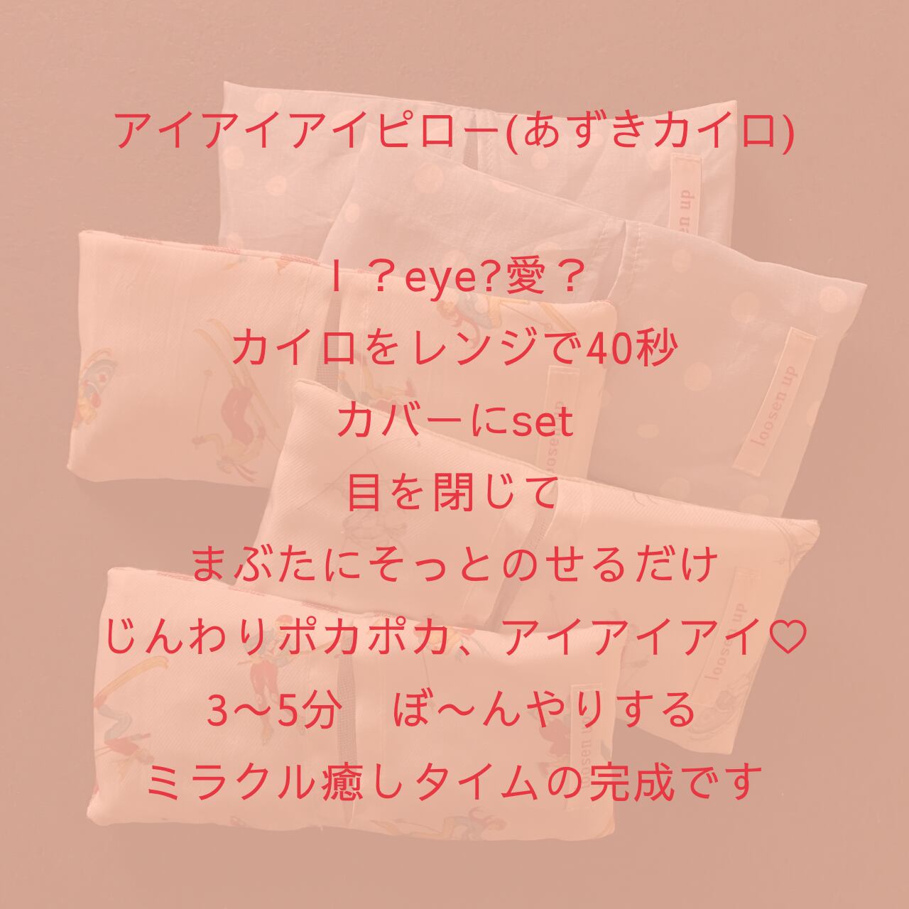 あずきカイロを電子レンジで40秒ほどあたため、カバーにセットして目の上に3〜5分載せてじんわりお過ごしください。